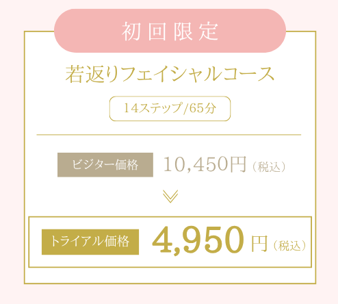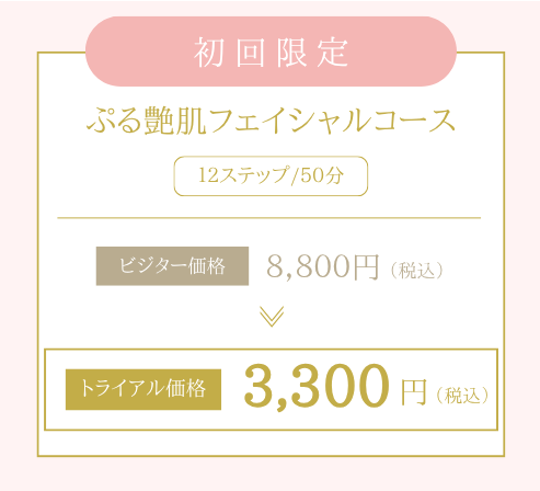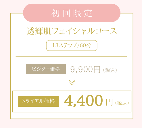 ぷる艶肌フェイシャルコース、透輝肌フェイシャルコース、若返りフェイシャルコースを3300円(税込)からご体験いただけます。