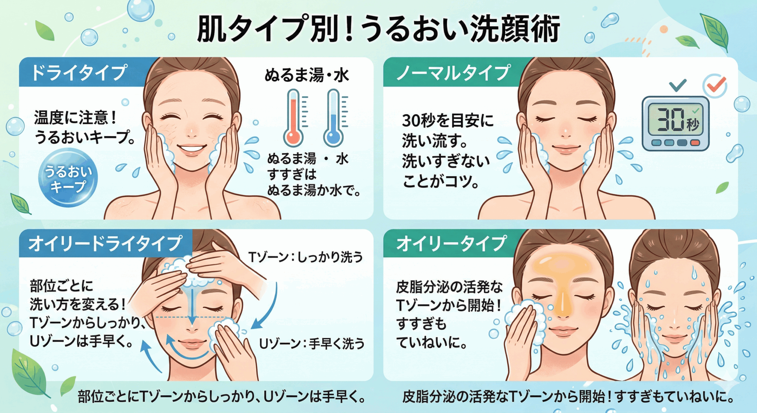 この記事では、肌タイプ別の“ウオッシング(洗顔)のポイント”について分かりやすくご紹介します。